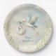 Boy baby shower paper plates with a classic design featuring a lovely stork delivering a bundle of joy with vintage vibes in blue. Easily personalise the text. - Kate Eden Art