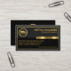 A rectangular gold border encapsulates a grey and black layer with a gold tab near the centre. Riding on this gold tab of success is your prestigious name and job title with a gold truck logo you can use on the left. Just below all this, in the black layer, lies the business name, its contact details and a slogan caption (which you can change) at the lower right corner.