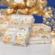 Gift Wrap is shown with a lovely modern art leaves print in soft neutral tones with a matte gold coloured text in fancy script of "congratulations".