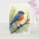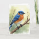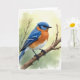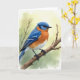 Designed with a close-up nature scene, this card features a small bird perched on a rugged, textured branch, drawn with careful feather detail that feels intimate and calm. The bird’s head and back are a rich blue, its chest glows warm orange, and its belly fades to soft white, creating a cozy contrast that reads like a gentle embrace. A dark, watchful eye and a slim black beak give it a tender, attentive look, as if it’s quietly keeping someone company ❤️. The branch shows natural bumps and uneven tones, adding a grounded, outdoorsy setting beneath the delicate pose. Behind it, the background melts into pale greens with soft yellow light, like a sunlit woodland seen out of focus. Any front text can sit neatly above the bird in a simple dark color, with a smaller line below in muted green to echo the scenery 🌼. Subtle scaled patterns appear along the wings, while the chest feathers look softer and lightly fluffed against the smooth wash of color. The scene is framed by a gentle haze of green and yellow with the branch cutting across the lower portion.