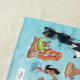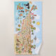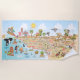Bright and detailed whimsical vision of Southern California - featuring Los Angeles and San Diego and Orange County plus many major and minor cities and most beach towns as well as the border cities of Tijuana, Tecate and Mexicali. Zany characters play on the beach and desert, mountains and valleys. This charming scene has it all – a surfer hangs ten while a mermaid lounges on a rock, a killer whale leaps out of the water as a t-rex roars a challenge, a muscular beach couple both flex to impress, zoo animals wait for tourists and a bull smashes into a bull fighter…