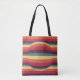 This image is a vibrant abstract artwork featuring horizontal bands of colour that bend and curve within a circular form at the centre, creating a striking optical illusion of a 3D sphere. The colour palette includes bold shades of yellow, red, orange, burgundy, and teal, giving it a distinct retro aesthetic. The effect is reminiscent of light bending around a planet or a stylised sunset, with the sphere appearing to "pop" out from the striped background.