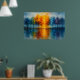 Immerse yourself in the radiant serenity of "Spectrum Grove: Colorful Trees Reflected in Water", a vibrant abstract landscape painting that captures nature’s harmony through bold color transitions and mirrored reflections. A row of trees bursts into a gradient of deep blues, lush greens, fiery oranges, and soft purples, all mirrored in a tranquil body of water below. The glowing central light draws the eye, while scattered birds and textured skies evoke peaceful movement. Perfect for lovers of colorful forest art, nature-inspired wall decor, and modern impressionist landscapes, this piece adds warmth and wonder to any space.