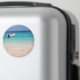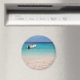 Round souvenir magnet with a speedboat in the turquoise blue water of the mediterranean sea at the small, white beach of Cala Goloritze in the Gulf of Orosei, Sardinia, Italy.