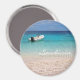 Round souvenir magnet with a speedboat in the turquoise blue water of the mediterranean sea at the small, white beach of Cala Goloritze in the Gulf of Orosei, Sardinia, Italy with the text: 'Sardinia, Golfo di Orosei'.