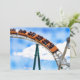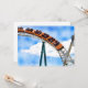 Photograph of an orange roller coaster speeding along the track against a light blue sky