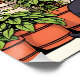 A fun comic book illustration of a woman sitting on her lawn chair on her patio, with her cat, a cup of coffee or tea and surrounded by purple clematis and hanging plants.