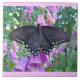Spicebush Swallowtail butterflies are rather large and mostly black. The females have a blue, iridescent shine to their hind wings while the males show green.