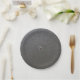 Paper plates featuring a photo of a spider in a web lined with dew.