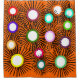 This shower curtain is covered with white circles with different coloured outlines and black lines coming out of then on a field of orange.