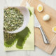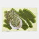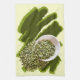 A unique kitchen towel design sports spilled green split peas from a white ramekin. The background is a diagonal ragged edged scratching. Leave it as is or click the orange Customise it! button to add text like a family name or quote. In customise, you can also select a background colour other than the pale yellow by going to Edit then Background.