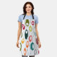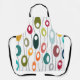 This apron has a mid-century modern design of horizontal coloured lines on a vertical black line with circles.