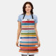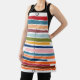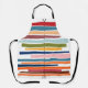 This apron has a mid-century modern design of horizontal coloured lines on a vertical black line with circles.
