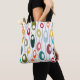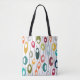 This tote bag has a mid-century modern design of horizontal coloured lines on a vertical black line with circles.