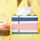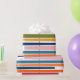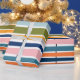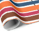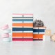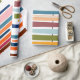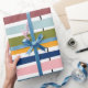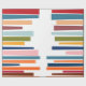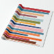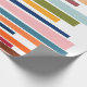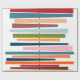 This wrapping paper has a mid-century modern design of horizontal coloured lines on a vertical black line with circles.