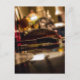 A postcard with a photograph of a vinyl record playing in a colourful room.