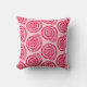 Throw pillow in a block print pattern, based on a spiral seashell, in deep fuchsia pink on a pastel coral pink background