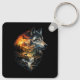 A breathtakingly dramatic double-exposure illustration fusing a majestic grey wolf portrait with a sweeping wilderness landscape of fiery mountains, pine forests, a cascading waterfall, moonrise, and silhouetted wildlife including a stag, bear, and soaring eagle.