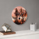 Timber wolf face photo superimposed over a sunset sky with silhouetted trees to create a mystic wolf wall clock