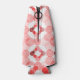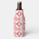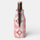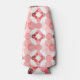 This bottle cooler has a geometric design of concentric circles in shades of red forming two squares on a field of white.