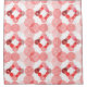This shower curtain has a geometric design of concentric circles in shades of red forming two squares on a field of white.