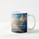 Coffee mug is shown in white with a spiritual art print with a scripture.