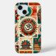 A seamless pattern fusing Hindu lotuses, Aztec glyphs, and Mayan pyramids, each cultural echo vibrantly portrayed in saffron, earthy reds, and jade greens.