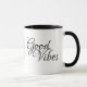 A beautiful black script reads "Good Vibes" on a white two-tone mug. The two script words are stacked and staggered in a feminine composition.