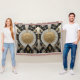 This appealing throw blanket features golden yantra-like circles in a rich gold-yellow hue, designed to reflect the spirit of ancient elements. Complementing the central motif are geometric graphic patterns in grey-black and beige-gold shades. The design showcases two yantras, each adorned with unique textures that enhance their graphical complexity and visual intensity, imparting a sense of insightful significance.