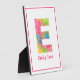 Cute tabletop plaque for nursery or kid's room features multi-coloured splatter paint letter E with customisable pink text and a thin pink border frame.