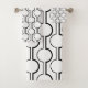 This shower curtain has a mid-century modern design of circles in black split in half and on lines on a field of white.
