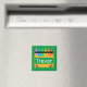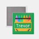 Bold and colourful personalised magnet for kids is great for playrooms and homeschooling areas. Design features a split crayon box with room to personalise with child's name in centre, on green background.
