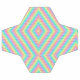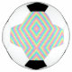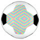 Split image showing a soccer ball design. The top half features a classic pattern with white and black pentagons transformed into colorful geometric shapes, while the bottom half displays the same geometric pattern laid flat. The design is vibrant with pink, blue, and green, conveying a playful and modern tone.