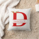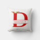 Christmas Monogram Letter A Deer Antlers Festive Throw Pillow is a two-sided design. The split monogram letter D, decorated with deer antlers and a flower wreath is on the front. There is a text field you can customise with your name. The back is a red and white stripe pattern