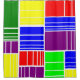 This shower curtain has a Bauhaus design of rectangles divided into ever smaller pieces in red, yellow, blue, green, purple on a field of white.