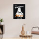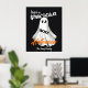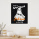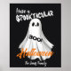A playful Halloween poster featuring a cheerful cartoon ghost with bold "BOO!" lettering across its chest. Set against a dramatic black backdrop, the design pops with whimsical typography and festive colours. The top and bottom text create a lively seasonal message, while the family name area is fully customisable—perfect for adding a personal touch to your haunted hello. Ideal for spreading spooky cheer with charm and flair.