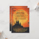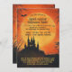 The Halloween party invitation features a dramatic and eerie design with a haunted house perched on a hill, silhouetted against a large, glowing yellow moon. The haunted house stands prominently in the foreground, its dark, jagged features contrasted sharply against the bright, eerie yellow moon. Bats are depicted flying around the moon, adding to the spooky atmosphere.