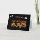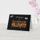 A 'Spooktacular Halloween' card with orange and yellow lettering on a black background and two pairs of spooky eyes peering out of the darkness. A digital design by Judy Adamson.