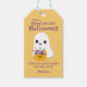 This design features a smiling ghost with a friendly expression, holding a pumpkin treat bucket. Perfect for Halloween celebrations.