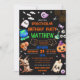 A modern Halloween themed design for a spooky party! This birthday invitation features a black and orange watercolor illustration with a border of Halloween themed images: a tree with a scary face, pumpkins, a spider web, a potion bottle, a candy, and a skull with a candle on top....