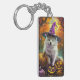 Spooky American Eskimo Halloween Witch and Pumpkin Key Ring
