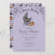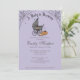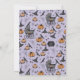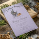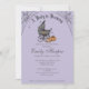 A whimsical hand-drawn Halloween "A Baby is Brewing" gender neutral baby shower design in black ink. Features an antique baby carriage, black crow, bubbling cauldron, witch's hat, pumpkins and spiderwebs on a light purple background. The back features a cute pattern of victorian baby carriages, crows, spiderwebs, witch hats, pumpkins and tiny mushrooms.