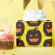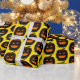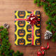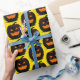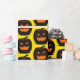 Trendy wrapping paper featuring aHalloween pattern with spooky black pumpkins on a bright yellow background.