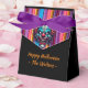 Personalised Halloween favour boxes. Do you find clowns and carnivals creepy? Then here is some scary Halloween supplies for you. Vintage spooky clown at the retro carnival holding a jack o' lantern and a bowl of candy surrounded by Halloween balloons.