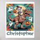 Bring your Halloween spirit to life with this whimsical and spooky design featuring a grinning skeleton riding a mummy-wrapped T-Rex! Perfectly balanced between creepy and cute, this vibrant artwork shows the duo carrying pumpkin candy buckets under a crescent moon and flying bats – the ultimate trick-or-treat dream team.