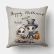 This Halloween themed throw pillow features a spooky and cute, gothic cartoon style illustration. An image of a boy skeleton wearing a top hat and suit jacket, and a little ghost girl porcelain doll are pictured at the bottom. Two cute bats fly above their heads as they carry their jack o' lanterns through the night. A "Happy Halloween" greeting is printed across the top of the pillow in an elegant script font. The background features a shadow pattern.