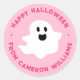 Round Halloween stickers featuring a spooky, white ghost and customisable text "Happy Halloween" and your name. White text on a pink or custom colour background.