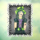 This window cling has a spooky pretty girl with a spiderweb and purple moon tattoos wearing a bright green hat in a black barbed branched frame.