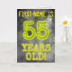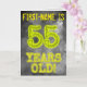 The front of this spooky looking, editable birthday card design features the message "55 YEARS OLD!" with characters and digits having an eerie glowing aura inspired look, on a mysterious gray cloudy mist-inspired background pattern. The front also features an editable recipient name. The inside features a customizable birthday greeting message. A customized birthday greeting card like this might be given to celebrate somebody’s fifty fifth birthday. [~Z0000365]