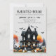 Invite your friends, family or neighbours to an annual haunted house event with this spooky and stylish invitation, perfect for setting the tone for a night of Halloween thrills. With a light grey background on both the front and back, the back also features black stripes for an extra touch of eerie elegance. The design showcases a simple yet striking black, orange and white colour scheme, with a mix of ornate and serif fonts. At the bottom, a black vintage haunted house is brought to life with orange pops of colour from pumpkins, jack-o’-lanterns, and spooky trees, while cute ghosts and bats add a playful touch. The distressed font adds a vintage, old-timey vibe, making it perfect for your haunted house or even a Halloween party if you prefer. You can customise the look by changing the background or stripe colours to fit your theme. Spooky Neighbourhood or Business Halloween Haunted House Invitation Ghosts Bats Stripes.